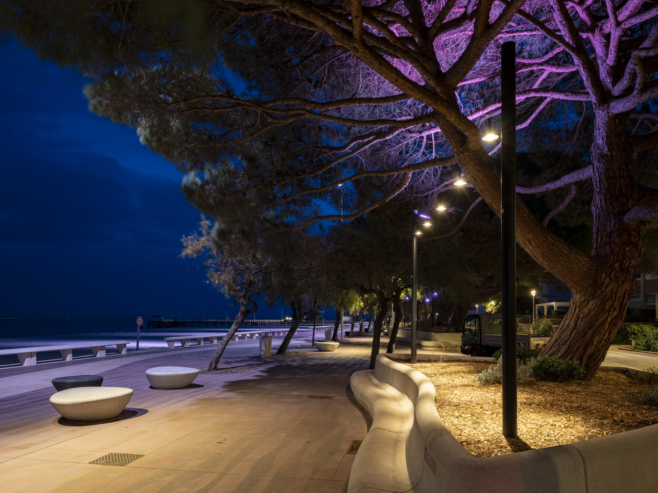 The HUB SHADE combines functional lighting and luminous restraint. Its anti-glare louvre cap system limits upward light diffusion, preserving the immediate nocturnal environment and reducing sky glow.